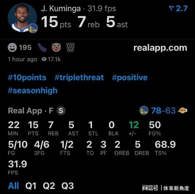 令人惊喜的是,今日被提上首发的库明加,11次投篮命中6次,三分球6投4中,得到17分、9个篮板及6库明加今日确实拼尽全力,毕竟全球都在预测他今年或将被交易,他自然渴望证明自己。上半场时,库明加单防东契奇,若以100分为满分,我愿给他99分。成功防守东契奇后,库明加迅速推进,并为库里送上一记三分助攻。看来,交易计划可暂且搁置,库明加值得留用。
